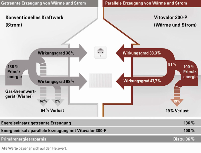 Im Vergleich zur konventionellen getrennten Energieerzeugung, Strom durch ein Kraftwerk und Wärme durch ein modernes Gas-Brenngerät, schneidet eine Kraft-Wärme-Kopplung wesentlich besser ab. Der gesamte Wirkungsgrad ist deutlich höher, die Primärenergieersparnis liegt bei bis zu 36%. Mit anderen Worten: bei der konventionellen Erzeugung von Strom und Wärme liegt der Gesamtverlust bei 64%, während es bei der parallelen Erzeugung von Wärme und Strom durch KWK-Systeme nur 19% sind.