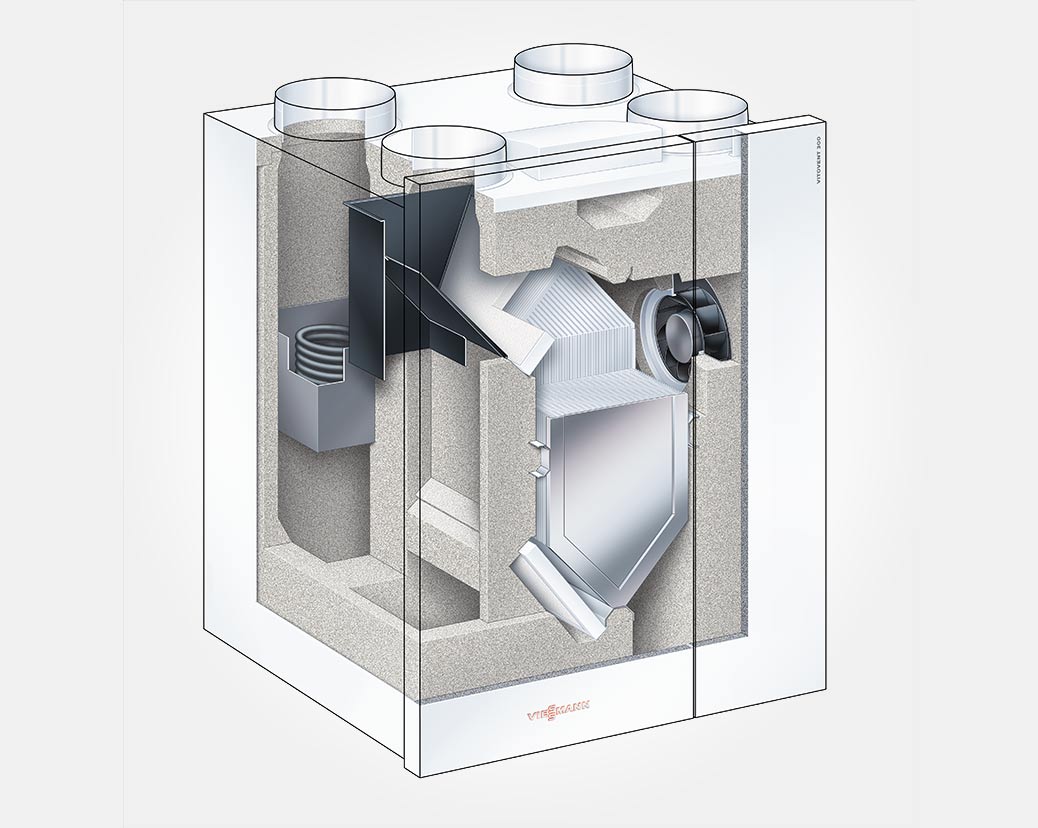 In der warmen Jahreszeit kann der Wärmetauscher des Vitovent 300-W über die integrierte, automatische Bypassklappe komplett umgangen werden. Durch diese temperaturgesteuerte Schaltung gelangt in der Nacht kühle Außenluft in die Räume und sorgt für eine angenehme Frische.